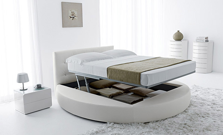 | Letto versione tondo con conteniore, diametro 220 cm | Testiera 170 x 150 cm Letto 220 x 170 cm Materasso 200 x 160 cm |