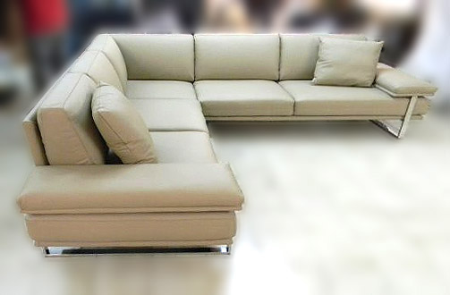 Divano originale e moderno con piedi e supporto-bracci in acciaio inox lucido: design insolito, e look modernissimo.